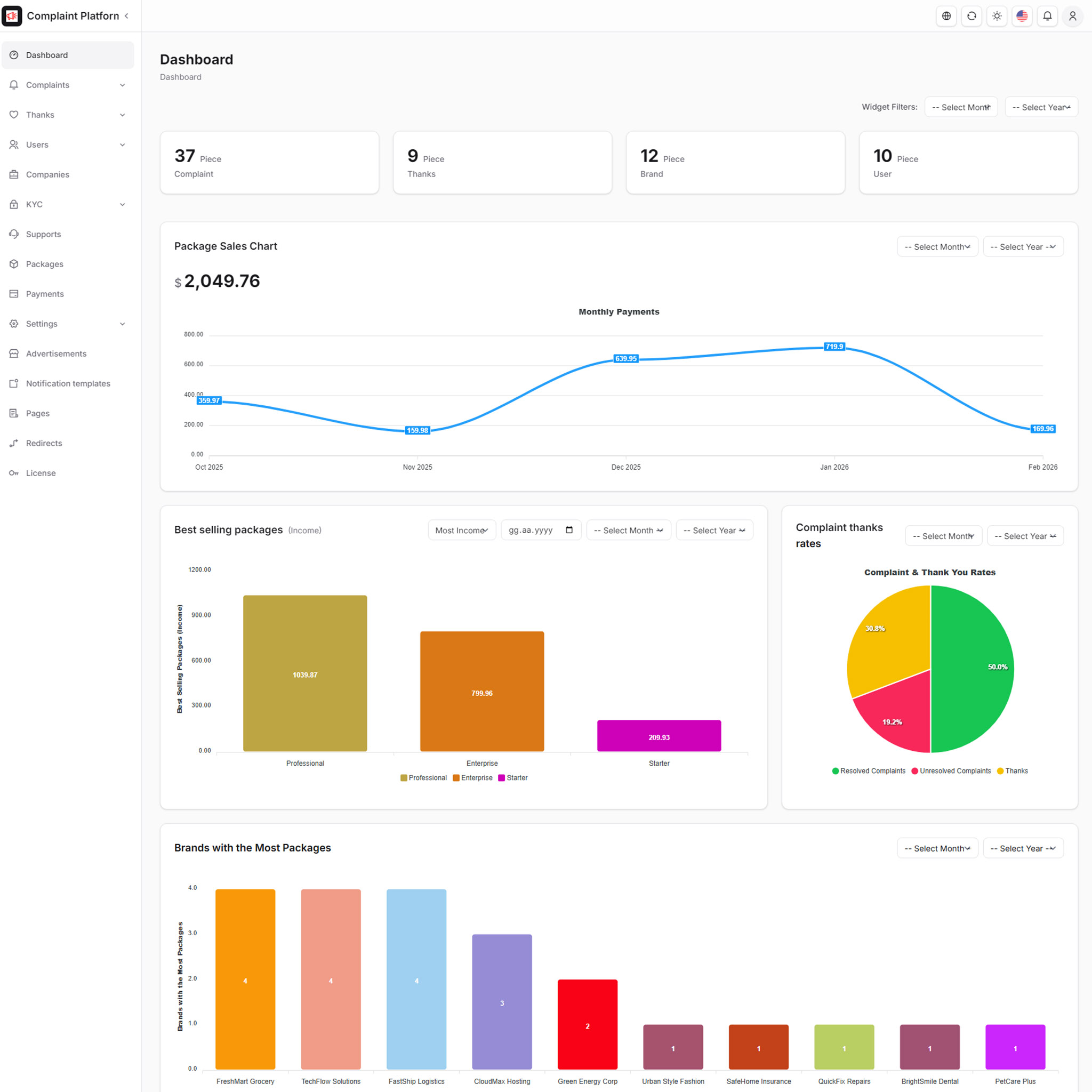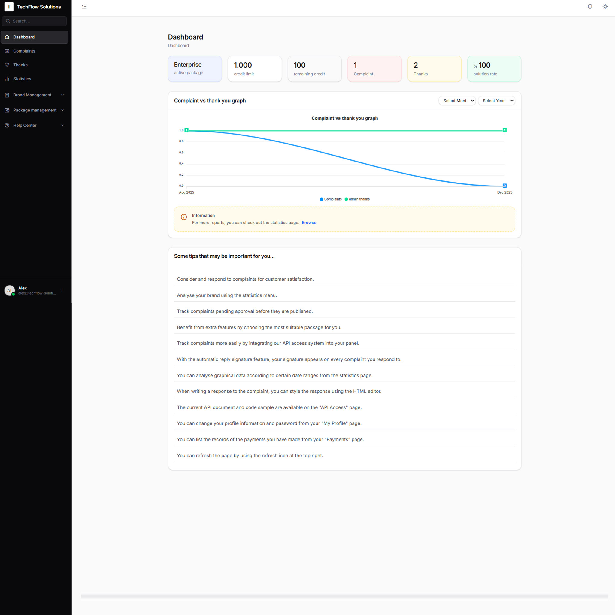 Markalar kendi panellerinden şikayetleri takip eder, personel ekler ve istatistiklerini görüntüler. KYC doğrulaması ile güvenilir marka profilleri oluşturulur.